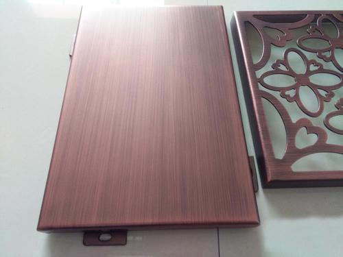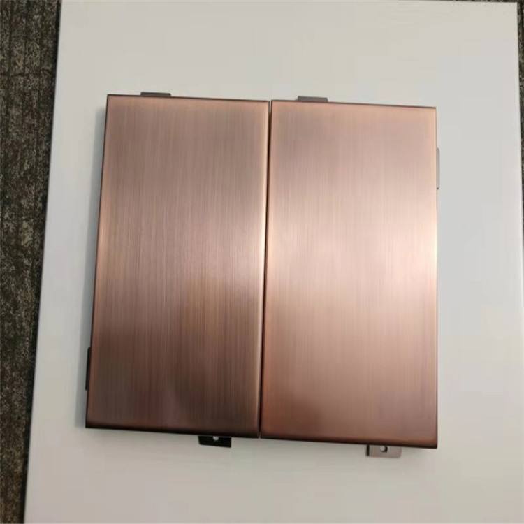 鍍銅拉絲鋁單板采用優(yōu)質(zhì)高強度合金鋁板,用“三涂二烤”工藝在鋁板上依次噴涂底漆、面漆、顏色漆及透明清漆,并在烘干固化后的仿銅氟碳漆表面進行拉絲工藝處理,氟碳漆仿銅產(chǎn)品圖案具有銅的實物感、立體感,效果逼真,紋理清晰,圖紋牢固耐磨。減少采用銅板裝飾的高額成本,節(jié)約資源,提高經(jīng)濟效益。